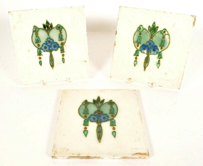 Three English 19th century art nouveau style ceramic tiles. Decorated in a green and blue colorway against a cream ground. Measuring approx. 15cm x 15cm.