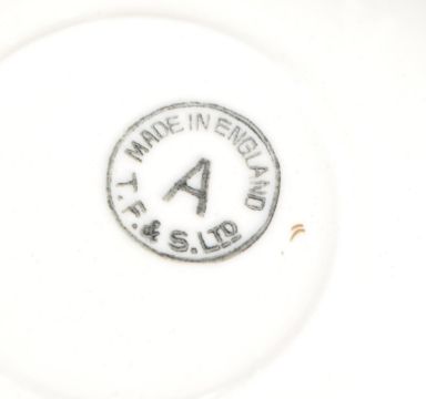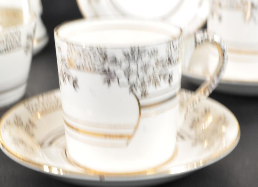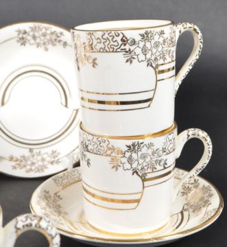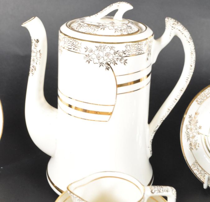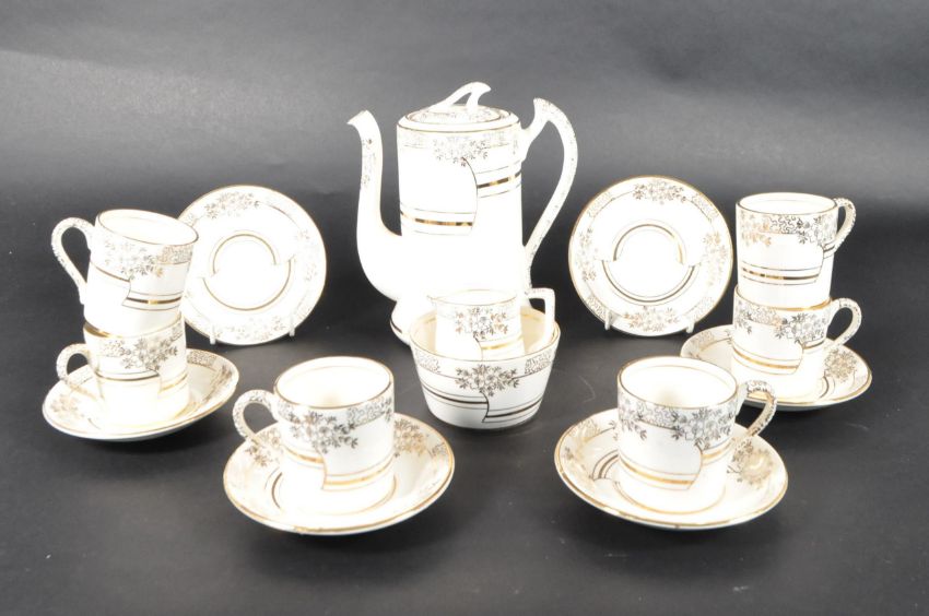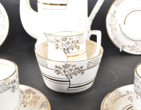 Thomas Forester & Sons - Mid century art deco china porcelain coffee set. Comprised of coffee pot, six cups, saucers, sugar pot and milk jug. Decorated in a gilt transfer design. Makers marks to the underside of the pieces.
