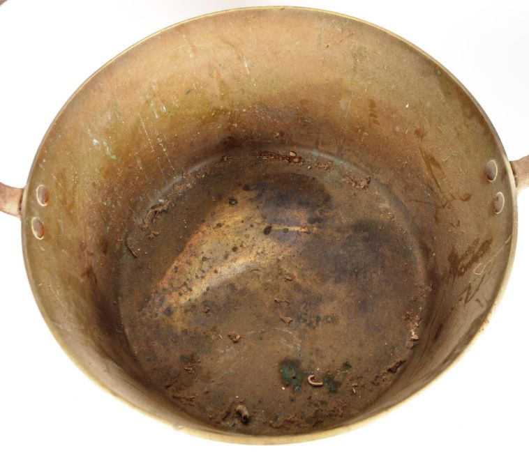 A Victorian 19th century solid brass & iron jam pan. Wrought iron carry handle with wide large circular base and deep interior. Measuring approx 41cm x 40cm x 36cm.