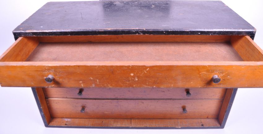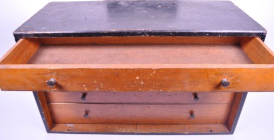 20th century wooden pattern tool chest with five drawers and black painted exterior. Each drawer with two small handles. Door with a lock able to be removed. Measuring approx. 31cm x 51cm x 20.5cm.