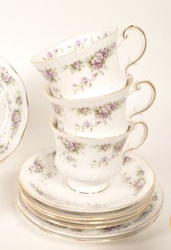 Elizabeth Chantilly - 20th century bone china tea service. Comprised of twelve tea cups, milk jug, sugar pot, twelve saucers, and eleven small plates. Each piece decorated in a purple floral transfer pattern to the border with gilt detailing. Makers mark to the underside.