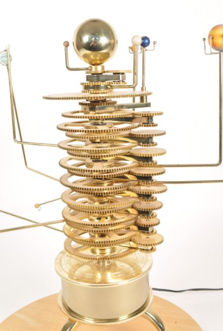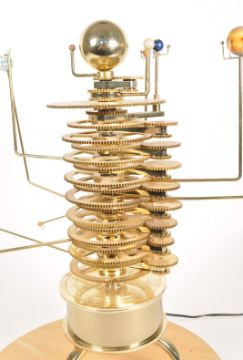 A 'Build A Model Solar System' magazine precision orrery. The orrery having a rounded wooden base, with brass tone external mecanism, featuring model planets. Alongside accompanying magazines and tools / parts.