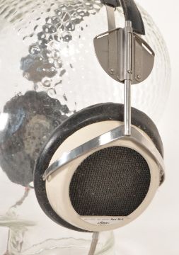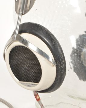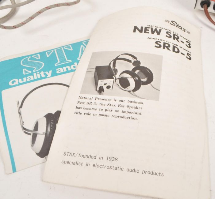 Stax - A mid 20th century circa 1970s Stax SR-3 electrostatic ear speaker headphones, alongside SRD-5 adaptor. The headphones in grey colourway. Alongside original manual.