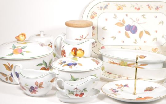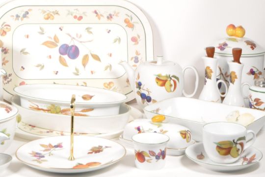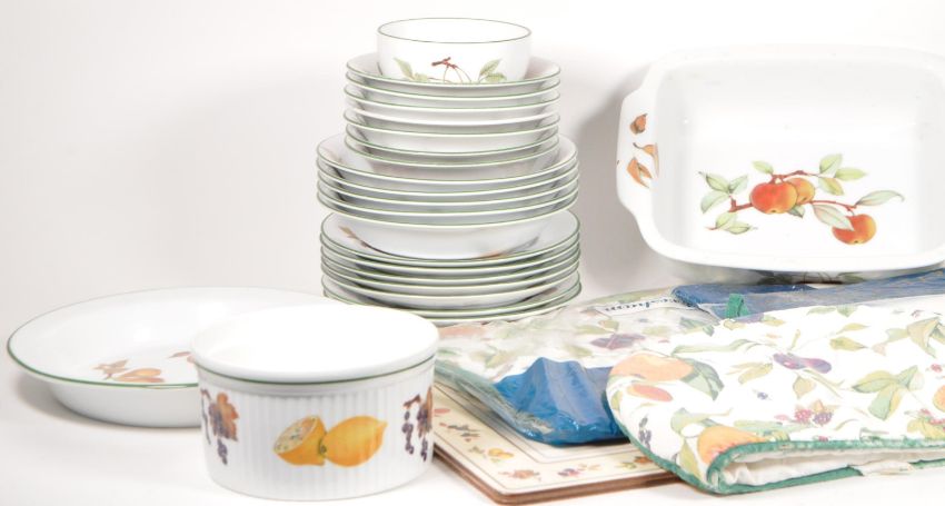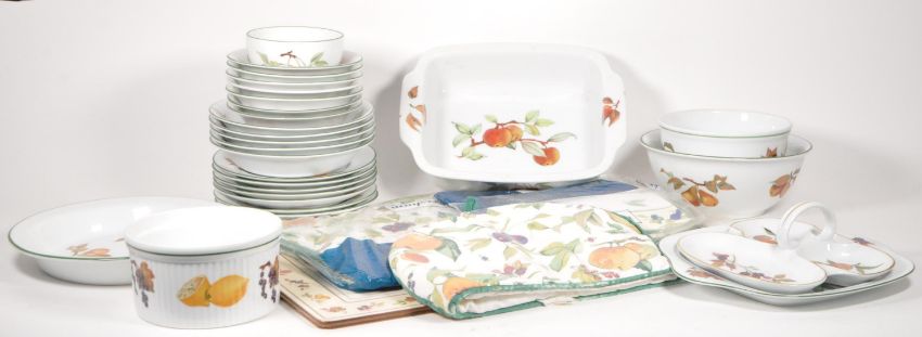 Royal Worcester - A vintage 20th century Royal Worcester bone china tableware service. The collection to include a selection of plates, dishes, teacups, two teapots, a serving tray, place mats, and other items. Each having white ground, with transfer decorated fruit designs to sides.