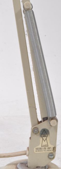 A vintage mid 20th century anglepoise style industrial desk lamp. The lamp in a white colourway, having a stepped circular base, with adjustable anglepoise style arm, and rounded shade to top. Measures approx: 82x40x23cm