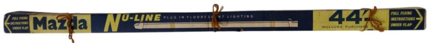 A vintage mid-century Mazda 'Nu-line' plug in fluorescent light tube. In original packaging box advertising usability for the kitchen, garage and workshop. Measures approx 130cm.