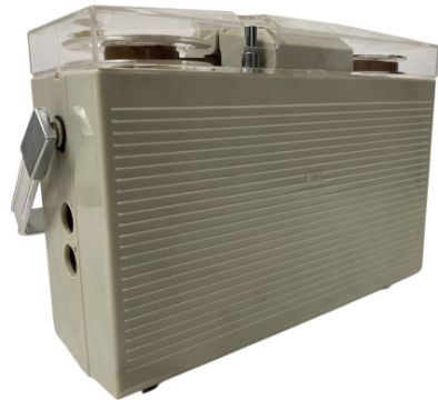 A vintage 1960s Philips EL 3586 portable 'All Transistor' reel to reel audio tape recorder with three keys on the head block (rewind, play and fast forward) and one record button to the right. With carry handle. 30cm long. 2013.398