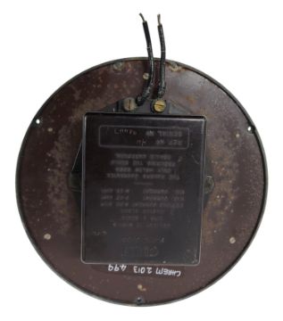 A vintage Gents of Leicester made slave wall clock No. 98447 for connecting in series with a Gents' Master Clock. The face with Arabic numerals, hour and minutes hands. Likely from an electricity station or similar venue. 24cm diameter. 2013.499