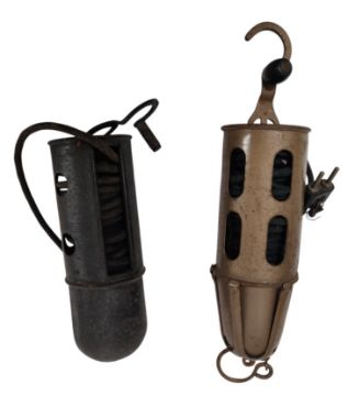 Two vintage c1950s / 1960s industrial or factory shielded working lamps. Both with caged bulb areas and holed metal bodies. Longest measures 16cm. 2013.731.1 & .2