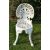 20th century cast aluminium Victorian style white painted garden dining suite comprised of a circular table and four chairs. Chairs with geometric and floral designed pierced backs and circular floral pierced seat raised on four cabriole legs. Accompanied by a matching circular table with pierced floral design top raised on three tripod cabriole legs below a smaller second tier. Measures approx: 68x80cm