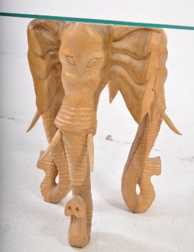 A vintage late 20th century carved wooden elephant side table. The base in the form of three carved elephants heads, stood upon their trunks. Having rounded glass top. Measures approx: 55x50cm
