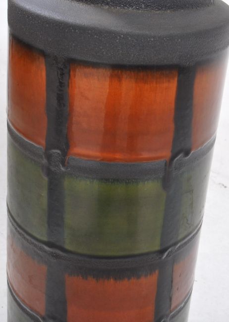 West German Pottery - A vintage mid 20th century West German Fat Lava style ceramic lamp. The lamp featuring grey, green, and orange patterned glaze. Of cylindrical form. Stamped '172 60 W. Germany' to base. Measures approx: 76x17cm