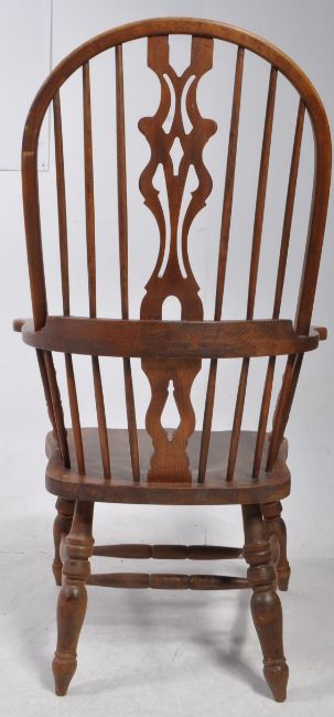 A 20th century stick back country carver Windsor chair. Featuring a double hoop frame with pierced splat and stick back behind scrolled arms, raised on a saddle seat on turned supports.