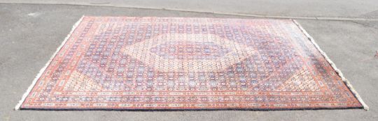 20th century vintage large Khorasan floor carpet rug. Features a red, blue and beige ground with repeating geometric patterns and floral motifs. Label verso. Measures approx: 360x264cm