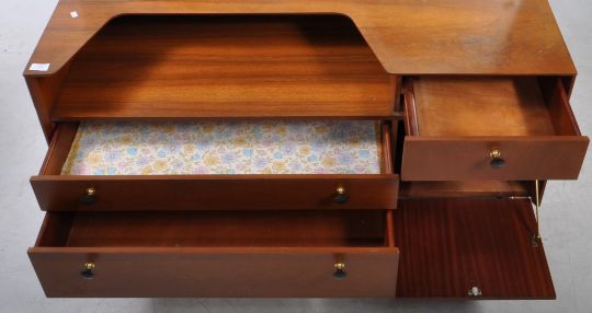 British Modern Design - Mid century teak wood dressing table. Raised on tapering legs with short and deep drawers with mirror atop. Measures approx: 117x115x44cm