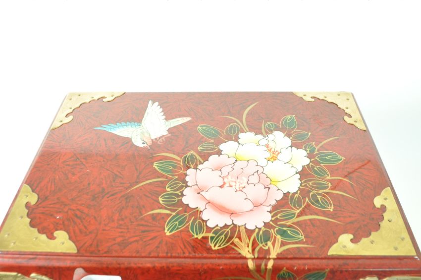 A contemporary chinoiserie red lacquered and gilt table top Chinese cabinet. Rectangular form with trinket top hinged lid, twin cupboard doors with single drawer to low. With floral design to front and metal mounts.