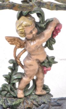 A late 19th century Victorian Coalbrookdale style umbrella / stick stand. The stand having hemi-circular drip tray to base, raised on shaped feet. Having Cherub figure to body, against foliate surround, with scrolled acanthus leaf design handle atop. Measures approx: 66x41x20cm