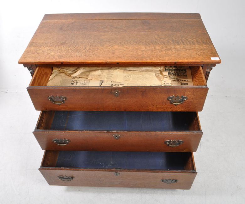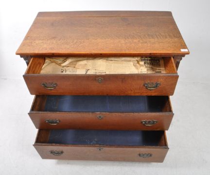 An 18th century George III mahogany bachelors chest of drawers. The chest of drawers raised on bracket feet with a shaped skirt. Having a bank of three drawers to face flanked by carved fluted columns. Each drawer with brass swing handles and armorial brass escutcheon. AF. Measures approx: 77x100x54cm