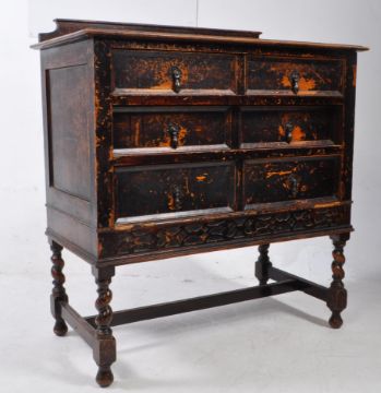 An early 20th century Jacobean revival chest of drawers. Gallery back, chamfered edge, three twin parallel drawers with carved apron to lower. Raised on block turned feet united H stretcher with metal drop pull handles. AF. Measures approx: 99x91x48cm