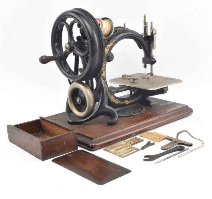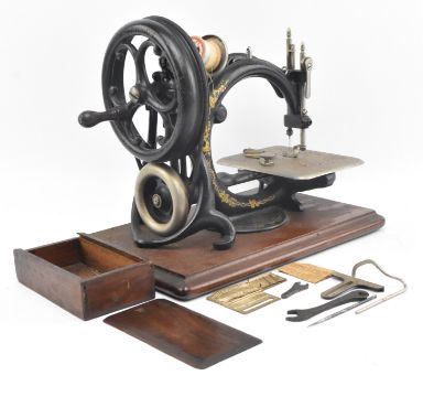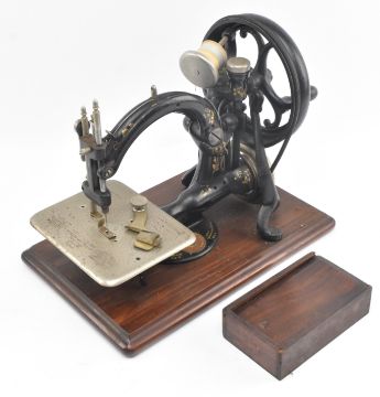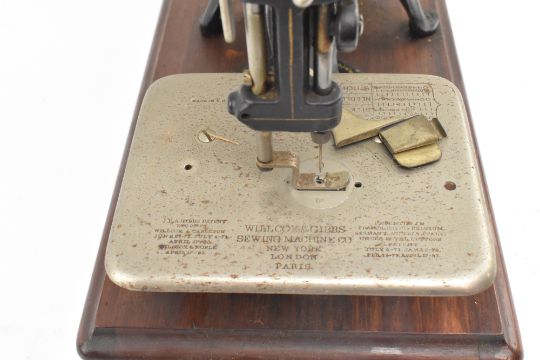 Willcox & Gibbs - An early 20th century Willcox & Gibbs hand crank sewing machine in original mahogany case. The machine mounted on mahogany base. Having iron frame with foliate gilt detailing. Marked made in USA.