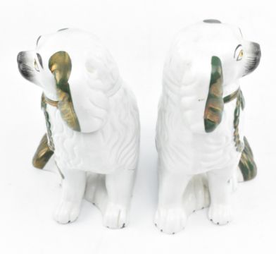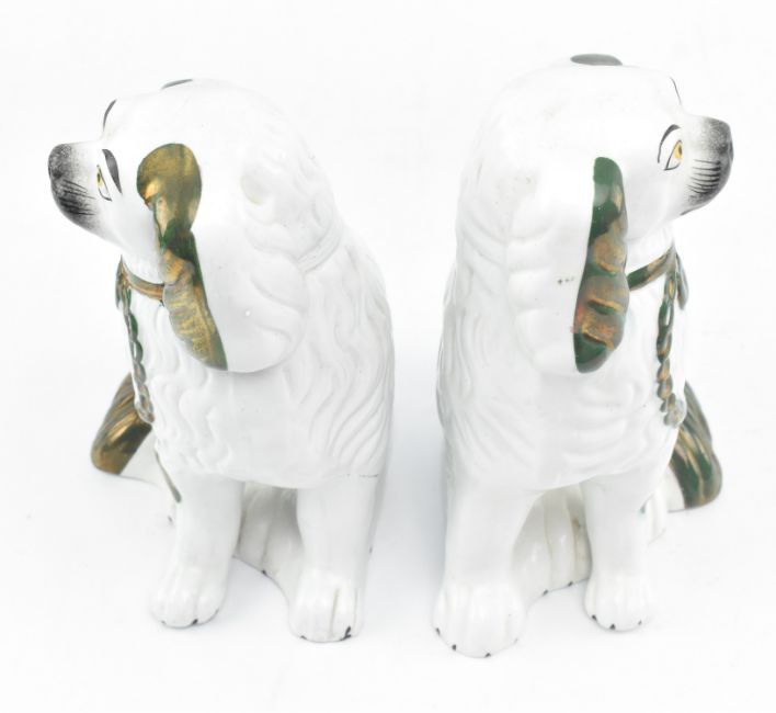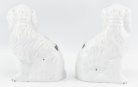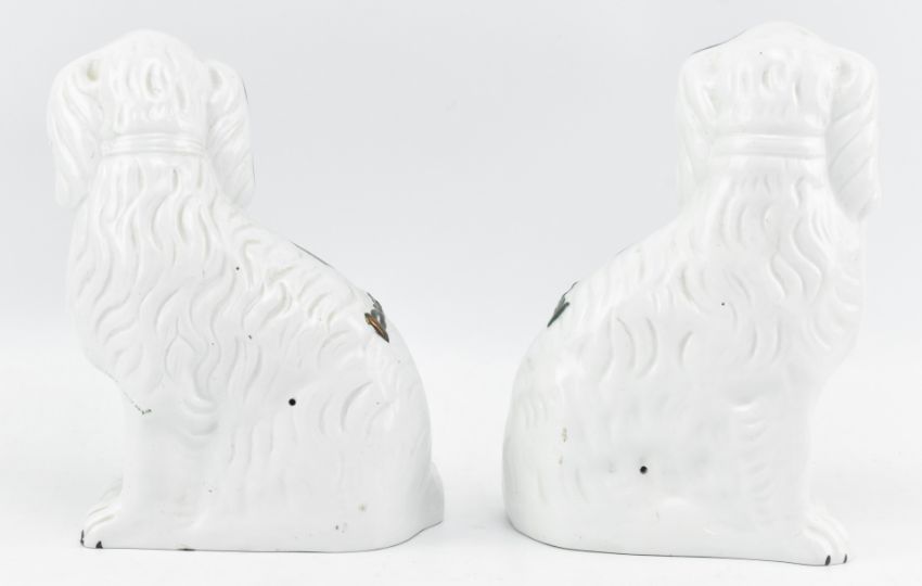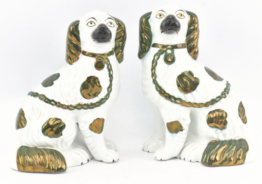 A pair of 20th century ceramic Staffordshire dogs. Each dog modelled seated. With white body & lustre spots. Unmarked.