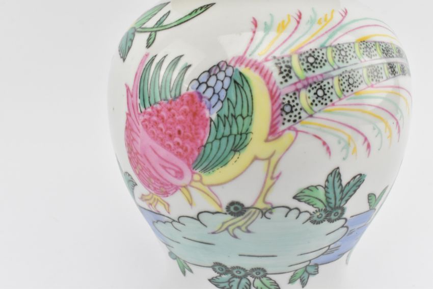 Two vintage 20th century Chinese ceramic lidded ginger jars and a small cloisonne brush pot. The cloisonne on cobalt ground with bamboo design, with blue and white lidded ginger jar with Foo finial to lid, sticker made in China underside, and a famille rose lidded vase of baluster form, unmarked.