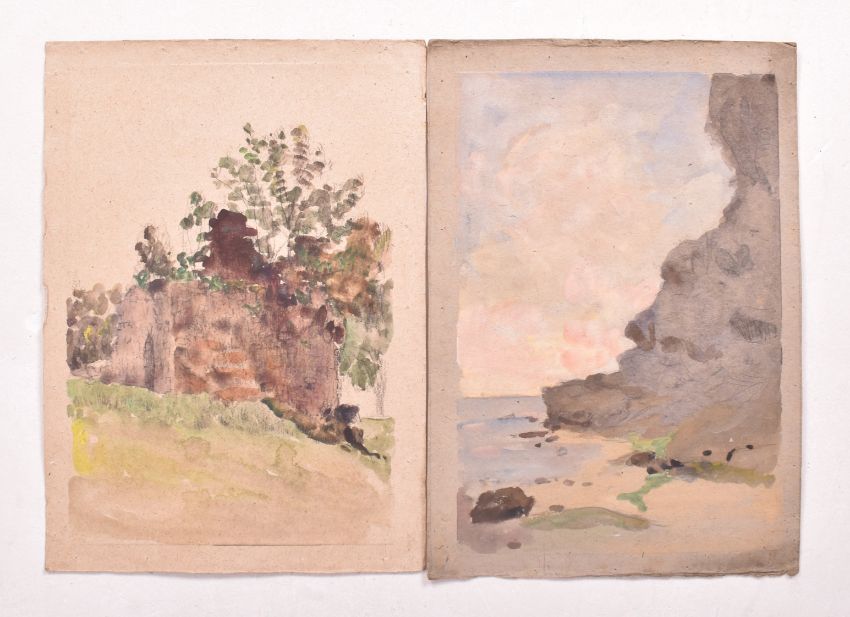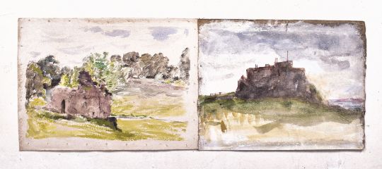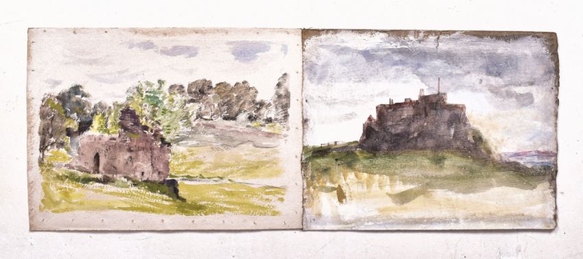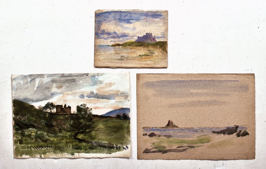 Alfred Edward Borthwick (1871-1955) - A collection of seven early 20th-century en plein air watercolour on paper landscape paintings. The collection including watercolours on paper depicting Scottish castles upon hills by the seashore or a lake. Unsigned. Unframed.