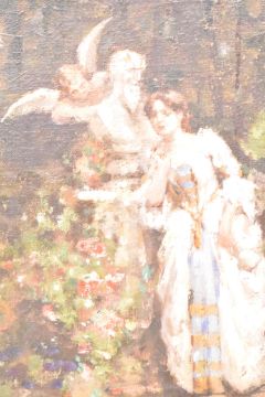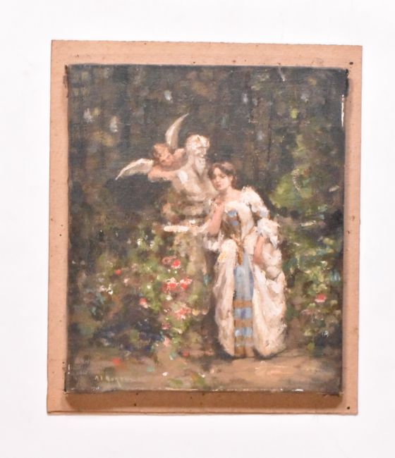 Alfred Edward Borthwick (1871-1955) - an early 20th century oil on canvas painting of an allegorical scene. The scene of a Regency lady in dress in garden with a cherub behind. Signed lower left hand corner. Unframed.