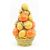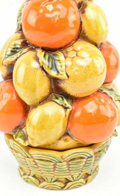 A vintage mid century continental ceramic centrepiece majolica vase in the form of a fruit display. The lidded bowl in the form of a tower of oranges & lemons in a basket. Unmarked.