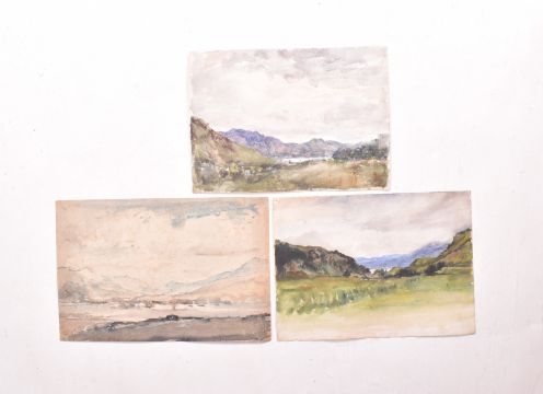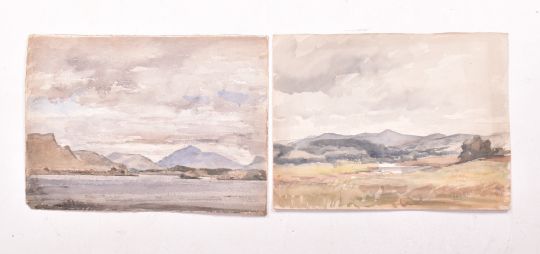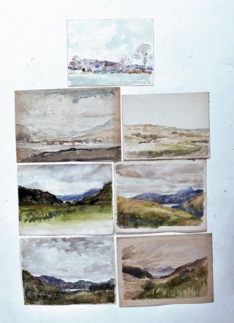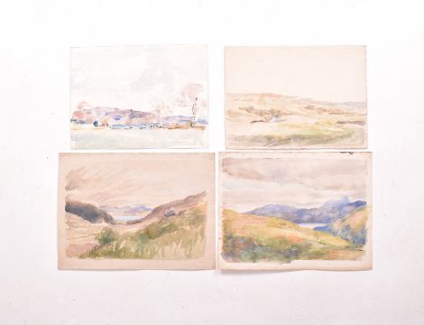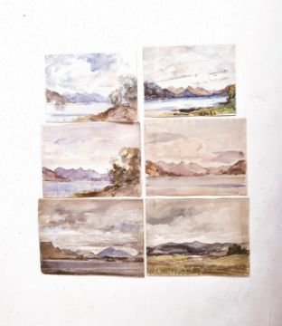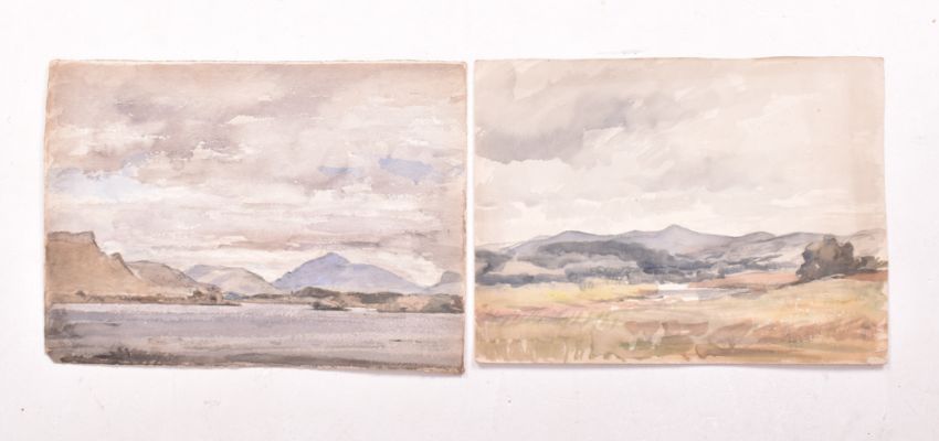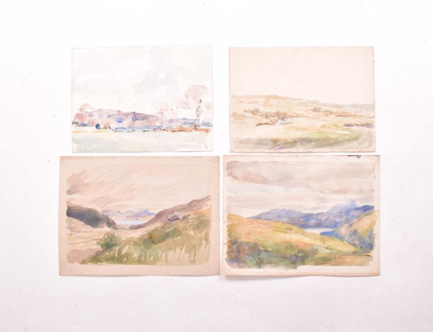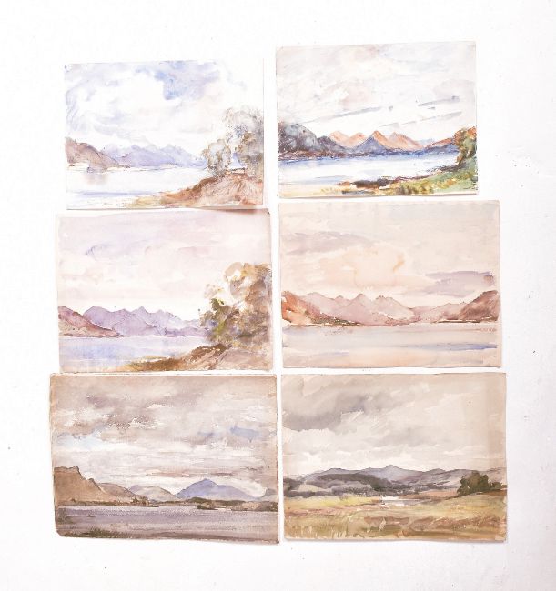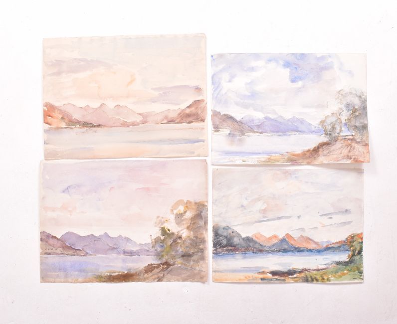 Alfred Edward Borthwick (1871-1955) - A collection of thirteen early 20th-century en plein air watercolour on paper landscape paintings. The collection depicting Scottish Highlands with lake views with mountain range in the background. Various views of similar subjects at different times of the day. Unsigned. Unframed.