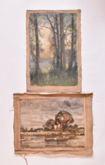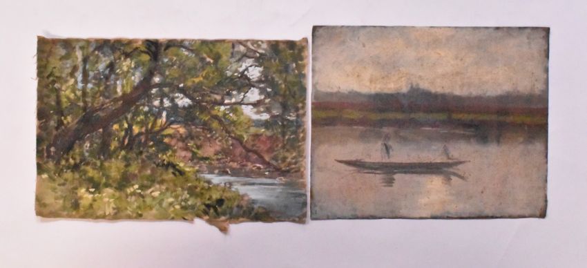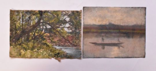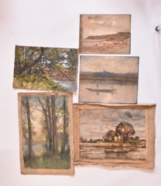 Alfred Edward Borthwick (1871-1955) - A collection of five early 20th century en plein air oil on loose canvas paintings of forest landscapes. The collection depicting different views, being maritime, forest scenes, and Scottish harbours. Unsigned. Unframed.