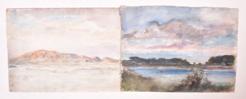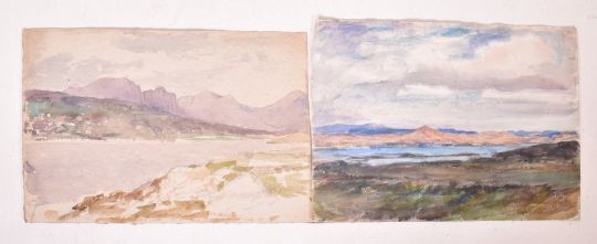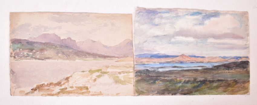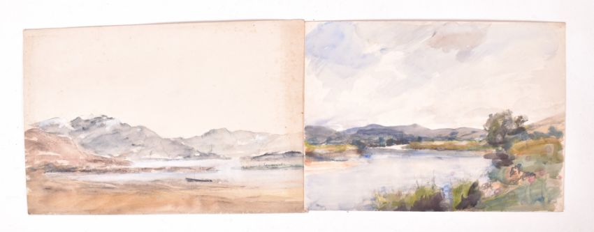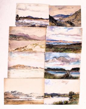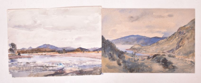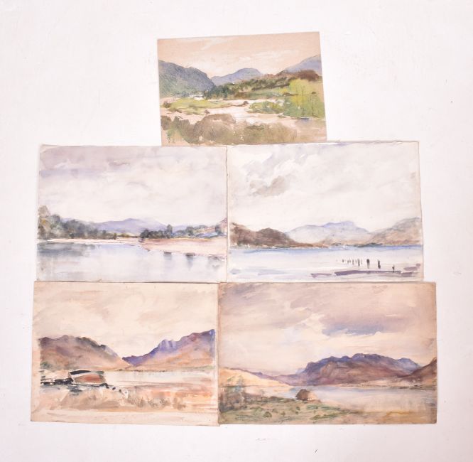 Alfred Edward Borthwick (1871-1955) - A collection of thirteen early 20th-century en plein air watercolour on paper landscape paintings. The collection depicting Scottish Highlands with lake views with mountain range in the background. Various views of similar subjects at different times of the day. Unsigned. Unframed.