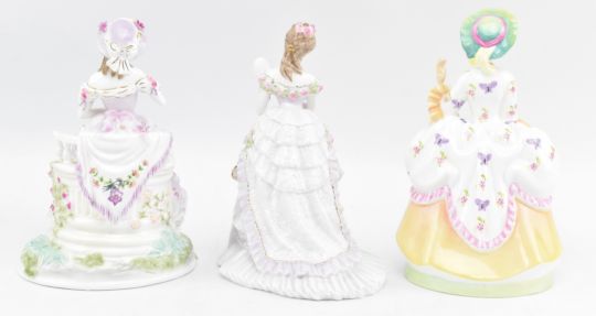 Royal Worcester - Splendour at Court - a collection of three limited edition figurines sculpted by John Bromley and two others. Comprising A Celebration at Windsor, A Royal Presentation & Millenium Debut; along with Embroidery figurine from The Graceful Arts series by Maureen Halson, and Peg Woffington by Peggy Davies.