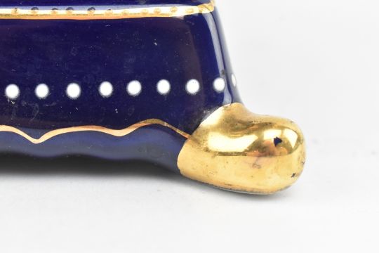 Limoges Porcelain - a modern 20th century porcelain twin handled lidded urn. The urn in cobalt with gilt hightlights, featuring central cartouche of Regency scene. Marked L. F. Limoges PRC to underside.