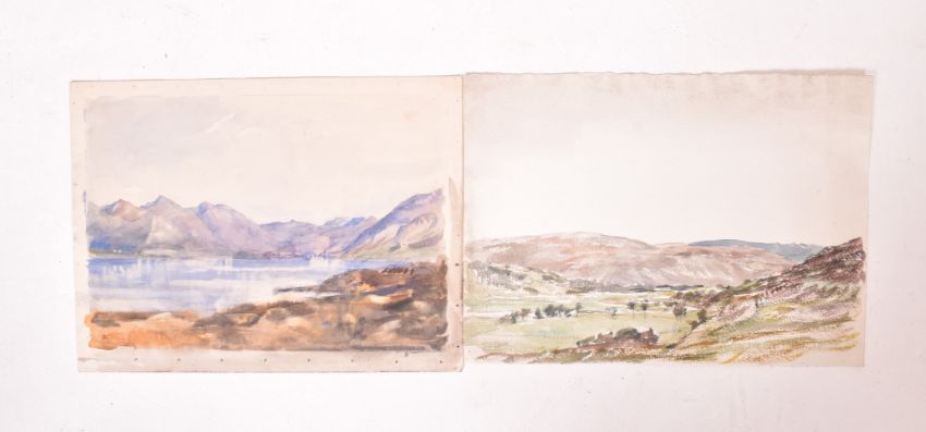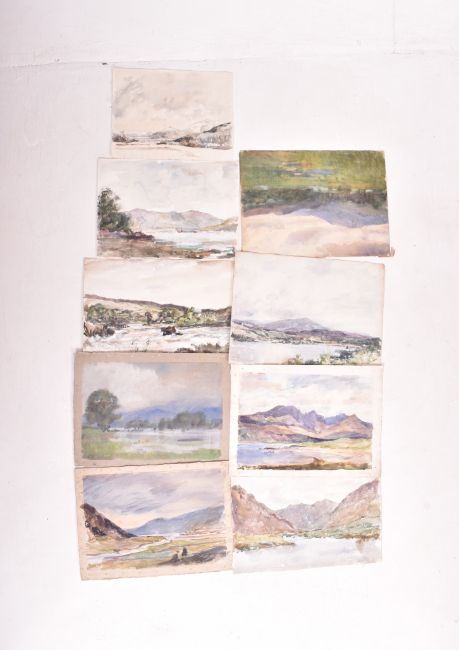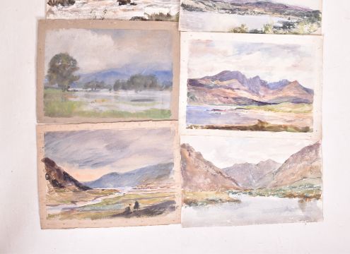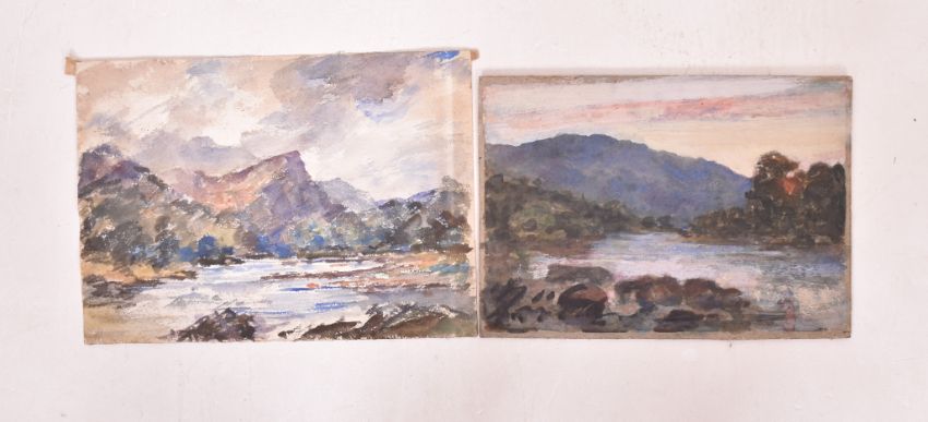 Alfred Edward Borthwick (1871-1955) - A collection of fifteen early 20th-century en plein air watercolour on paper landscape paintings. The collection depicting Scottish Highlands with lake / river views with mountain range in the background. Various views of similar subjects at different times of the day. Unsigned. Unframed.