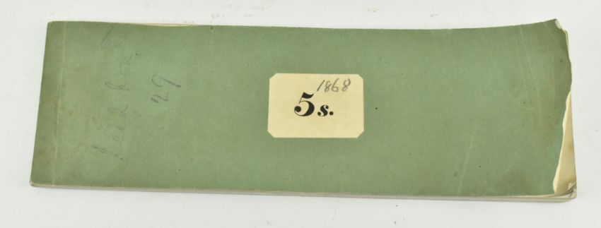 Stourbridge & Kidderminster Banking Company - a mid 19th century 1868 dated paper chequebook. The cheque book from Stratford on Avon Old Bank, produced by London Bankers Messrs. Smith Payne & Smiths. Blind stamped One penny to each leave. Original green paper wraps, priced 5s to front label, some edgewear with front wrap curling. The Stourbirdge & Kidderminster Banking Company was taken over by the Birmingham Banking Company in 1880.