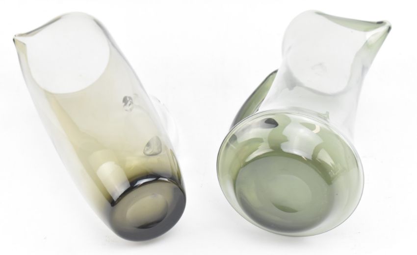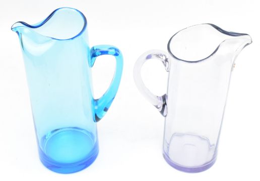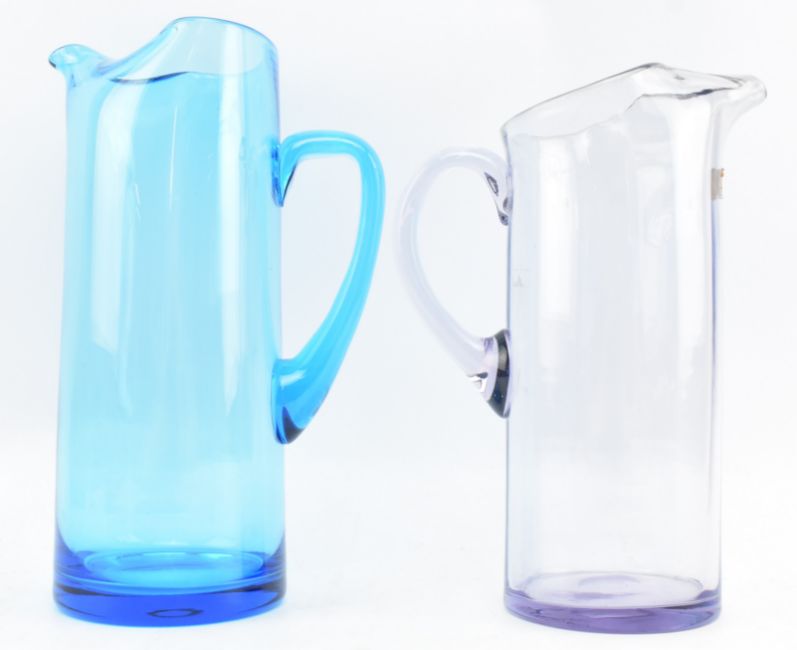 Whitefriars, Holmegaard & similar - a collection of four vintage mid century glass ewer jugs. Comprising a ewer in blue, lilac, two smoked grey examples & a clear glass decanter with stopper.