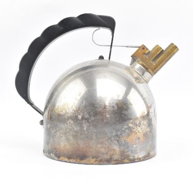 Alessi - an Italian retro late 20th century inox whistle kettle. The kettle having a black handle over a dome shaped body. Stamped to underside.