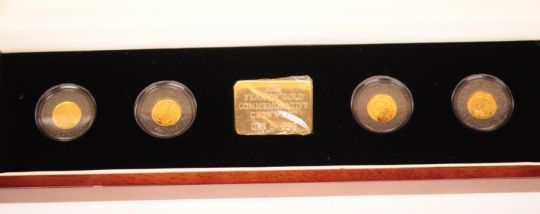 The London Mint Office - A 2009 Tristan Da Cunha Year of Gold Commemorative Crown set. The collection to include four 1/25th of an Ounce (1.13g) .9999 Gold One Crown Proof Coins. Each coin in plastic proof protective case, in display case with certificate. Approximate total weight of 4.5g of .9999 Au (24ct).