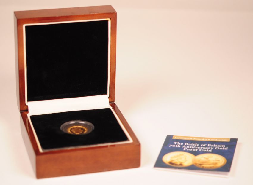 A 2010 Tristan Da Cunha The Battle of Britain 70th Anniversary 22ct Gold Proof Five Pounds Coin. The coin having Aerial battle in which an RAF Spifire and Hurricane pursue a German Me109 to reverse, and Queen Elizabeth II bust (right) to obverse. Of 22ct Au composition, weighing approx. 2.9g. In presentation case, with certificate. Limited Edition number 046 / 499.