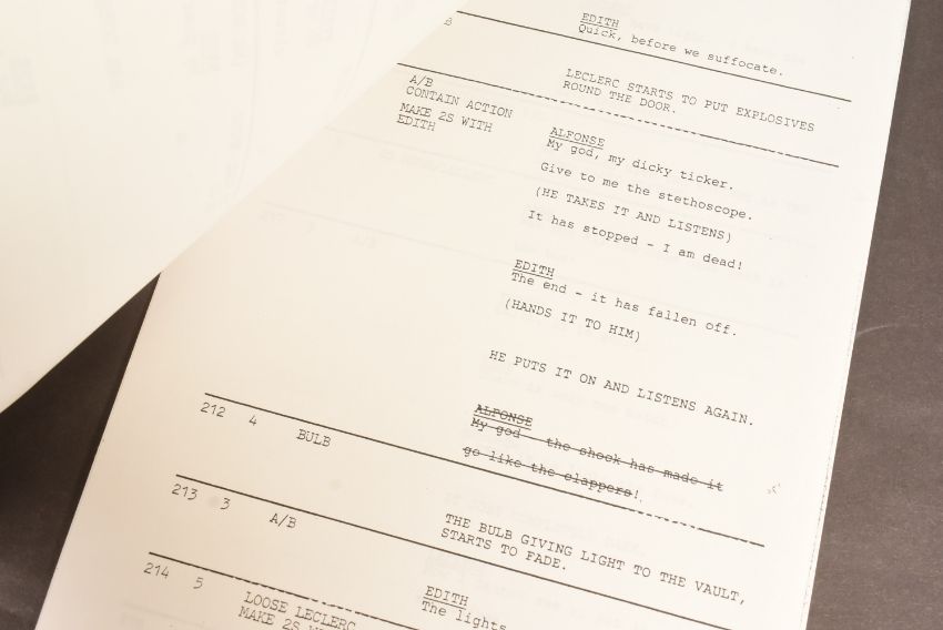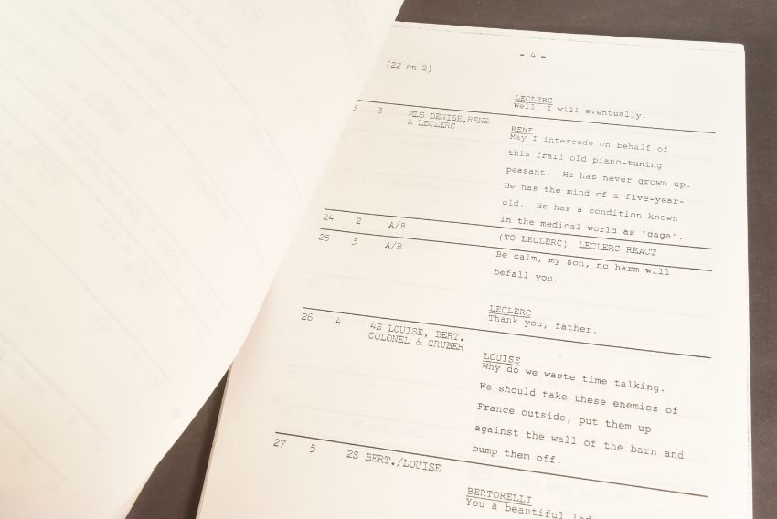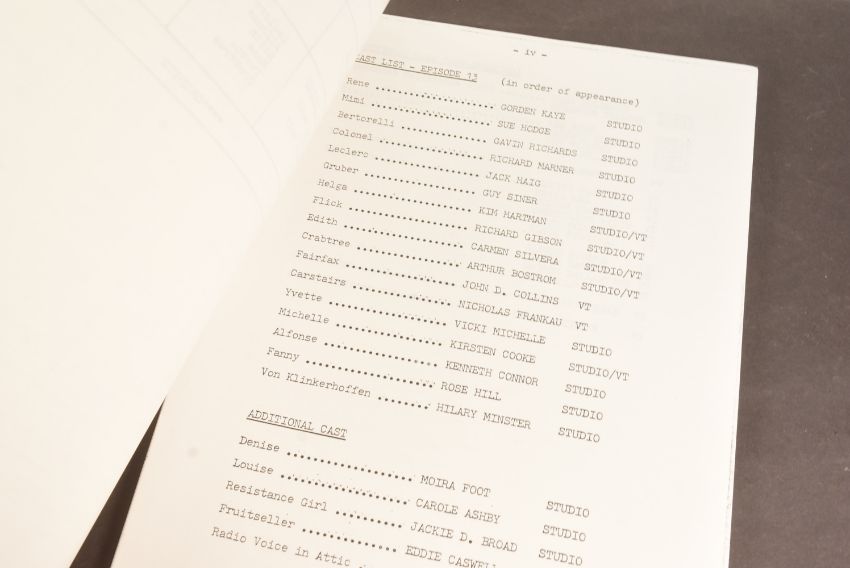 'Allo 'Allo! (BBC Sitcom 1982-1992) - Series 5 Episode 13 - original production used 'TX' script for the fifth series. Dated 29th April 1988. 49pp, plus Running Order pages, Cast List, and cover on off-white paper stock. Features the 'Allo 'Allo titles and illustrated flags to the cover. Original production used script. Some markings within.'Allo 'Allo! is a British sitcom television series, created by David Croft and Jeremy Lloyd, starring Gorden Kaye, Carmen Silvera, Guy Siner, Richard Gibson, Vicki Michelle and an ensemble cast. Originally broadcast on BBC1, the series focuses on the life of a French café owner in the town of Nouvion, during the German occupation of France in the Second World War, in which he deals with problems from a dishonest German officer, local French Resistance, the handling of a stolen painting and a pair of trapped British airmen, all while concealing from his wife the affairs he is having with his waitresses.