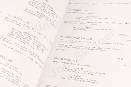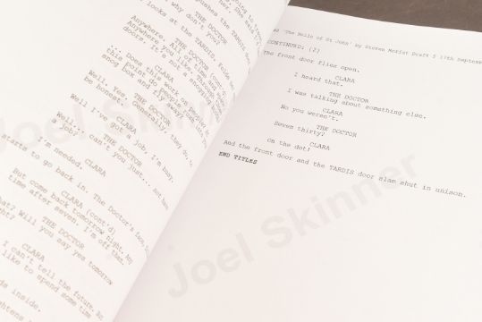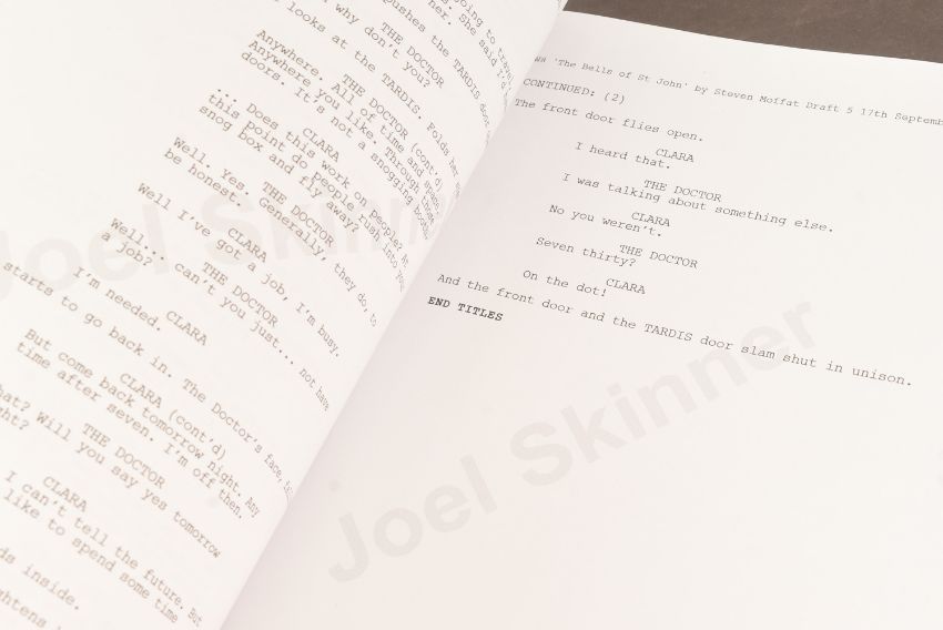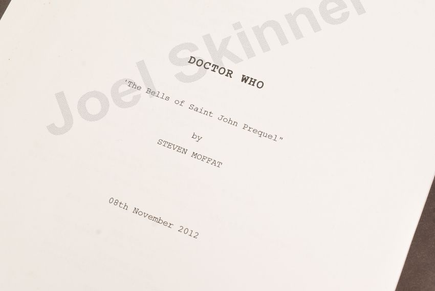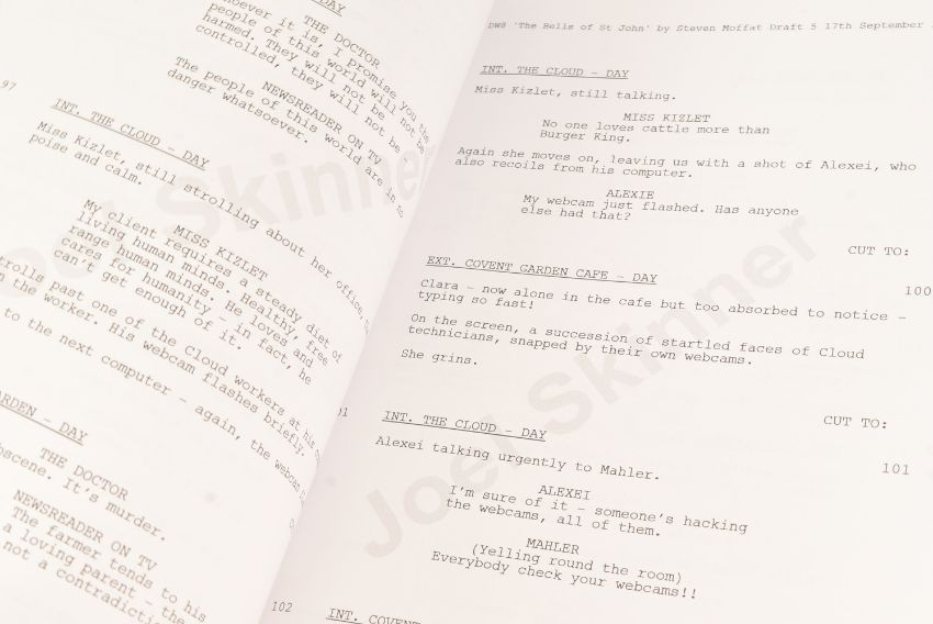 Doctor Who (BBC sci-fi series 1963 to present) - The Bells Of Saint John (2013 Eleventh Doctor era) - original production used full shooting script dated 17th September 2012 and noted as being 'Draft 5'. 125pp, double sided. Along with an original production script for The Bells Of Saint John Prequel, a webcast exclusive episode. 3pp, stapled to corner. From a member of the VFX crew.