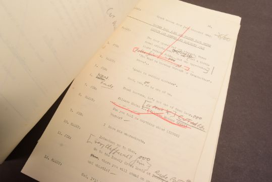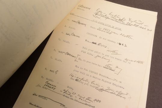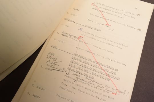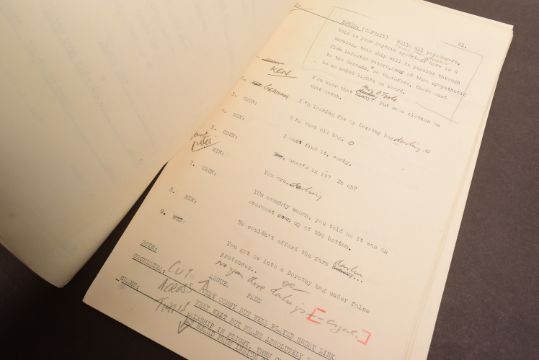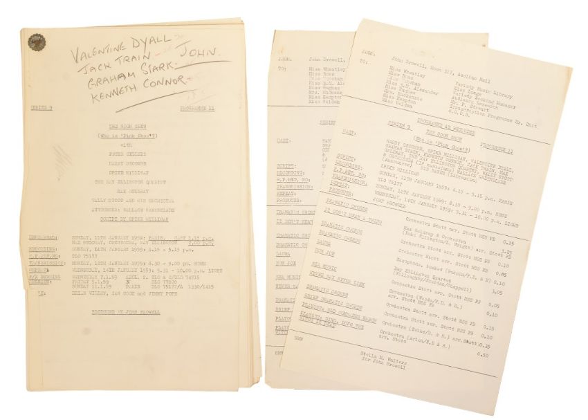 The Goon Show (BBC Radio Comedy Programme 1951-1960 starring Spike Milligan, Harry Secombe and Peter Sellers) – an original recording script owned and used by producer John Browell for Series 9, Programme 11 ‘Who Is 'Pink Oboe'?’. The script is well annotated throughout in Browell’s hand, with stage directions, altered lines, and general notes taken during recording. His name ‘John’ is noted to the cover page. Guest stars Valentine Dyall, Jack Train, Graham Stark and Kenneth Connor appear to have been added to the cast at the very last moment as the script features several hastily re-written lines to accomodate the actors. A short speech writtin in pencil to the back cover mentions their last minute appearances. 30pp, plus cover. With two original RX / transmission details sheets, and housed within its original card file. (3)