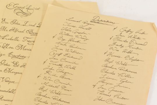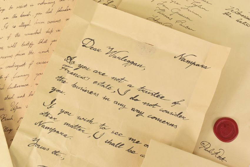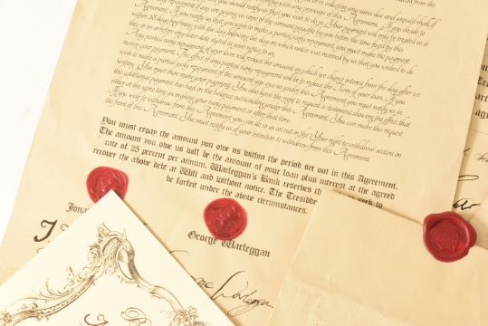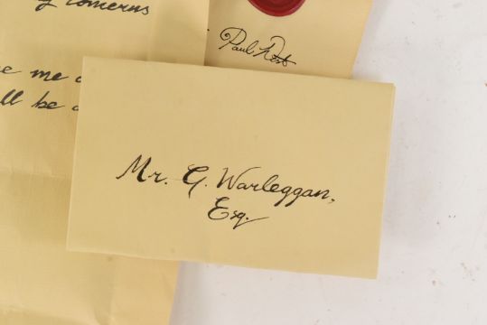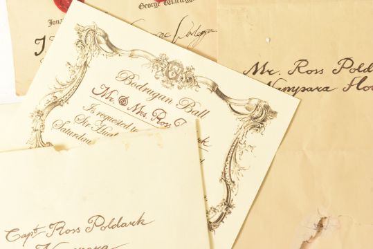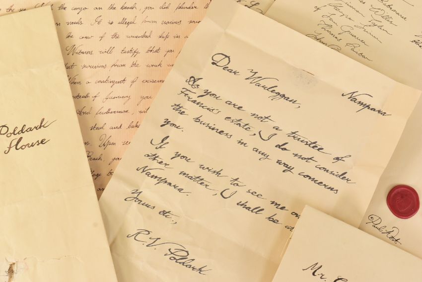 Poldark (BBC Drama Series 2015-2019) - a collection of original production made / screen used prop letters and documents, used throughout the series. Includes: several letters to Charles Warleggan, several with wax seals, letter to Mr Ross Poldark, an invitation to the Bodrugan Ball, Loan documents, and other items. All deliberately aged or made to appear used. Various sizes.