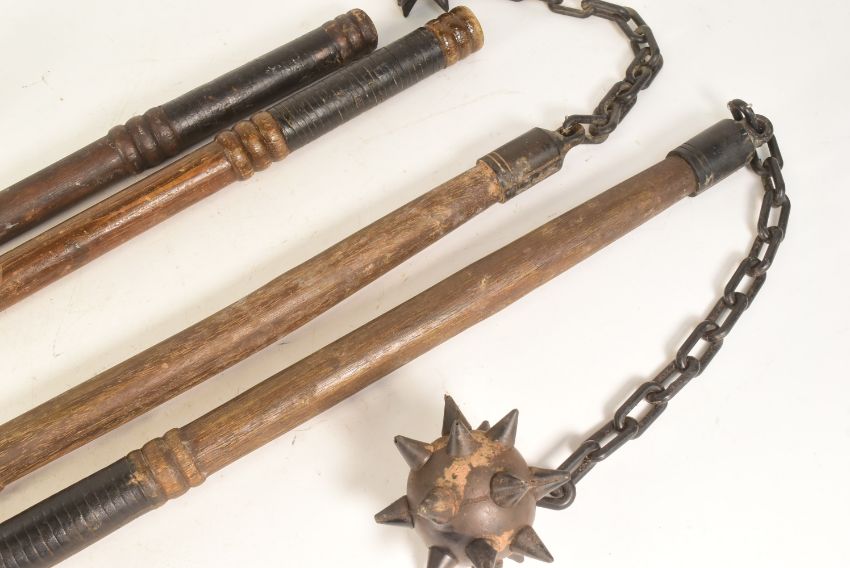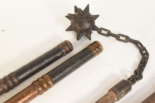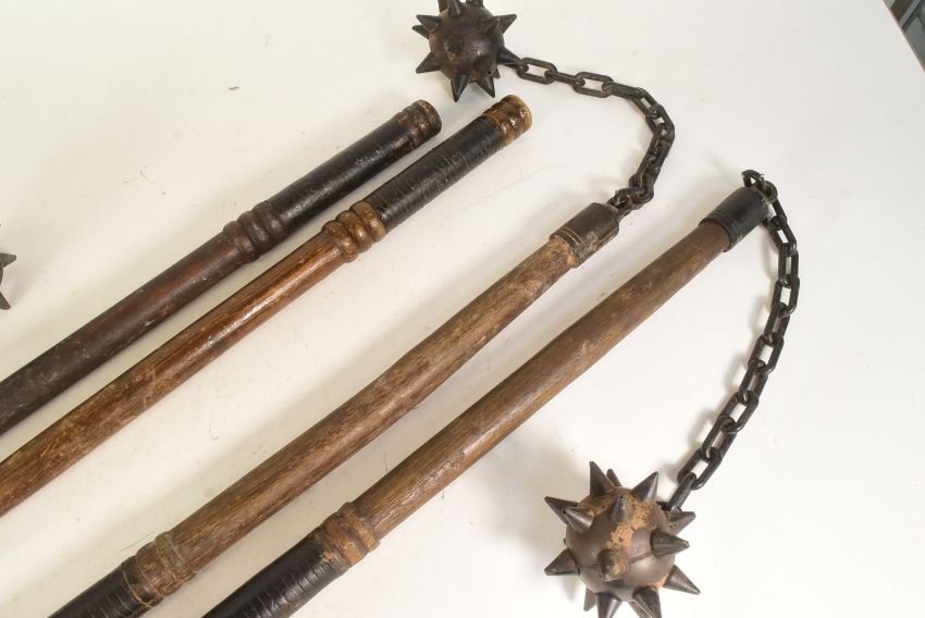 The Bastard Executioner (2015 American historical fiction drama television series, created by Kurt Sutter) - a collection of x4 production and screen used stunt / background mace weapons from the series. Each with wooden handle, with soft foam rubber spiked ball ends and lightweight plastic chains. All in production used condition, some of the rubber spikes are missing. Each was custom-made for production, at great cost. Each measures approx: 57cm long. The Bastard Executioner was filmed in Wales, United Kingdom, and featured a mostly British cast.
