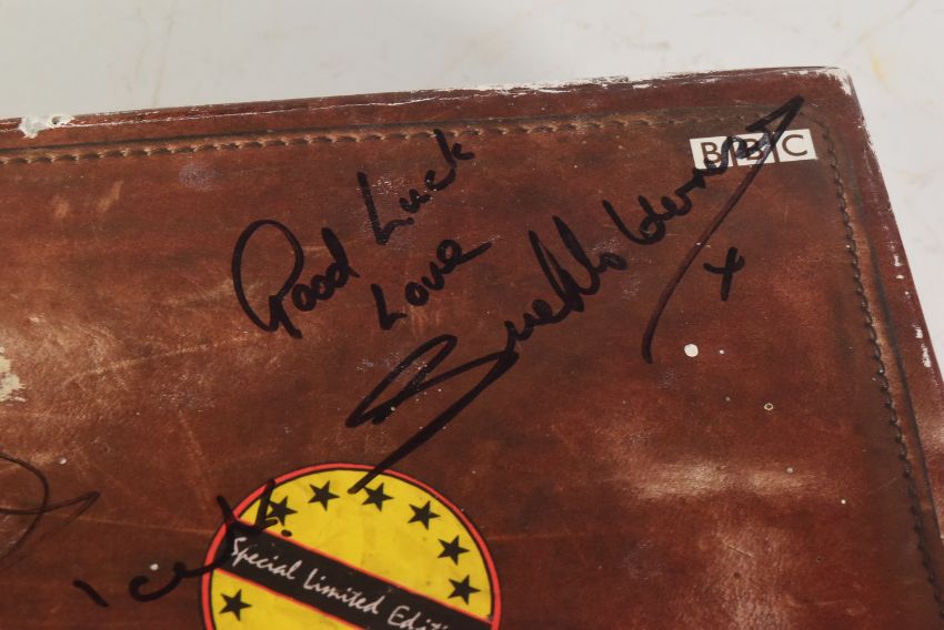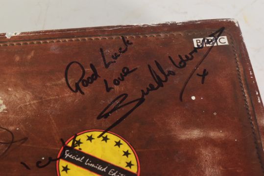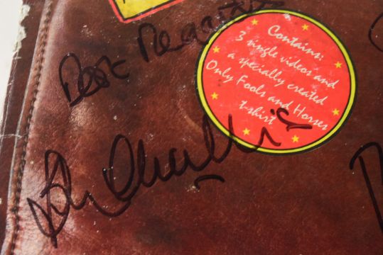 Only Fools & Horses (BBC Sitcom 1981-2003) - limited release original 1996 trilogy VHS 'suitcase' set, signed to the top by many of the original cast. Autographs include: Sir David Jason (Del), Kenneth MacDonald (1950-2001 Mike), Roger Lloyd Pack (1944-2014 Trigger), John Challis (1942-2021 Boycie), Sue Holderness (Marlene) and Patrick Murray (Mickey). All signed in black ink, undedicated. The set appearing unused, with the VHS tapes remaining factory sealed, along with the original t-shirt. Some wear to the cardboard, contents mint.