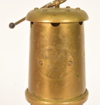 Brassed Off (1996 British comedy-drama) - an original cast and crew gift half-scale brass miner's lamp. Brass construction, complete with detachable burner and glass flue. A small plaque to the front is engraved 'Brassed Off - 1995'. Issued to cast and crew only when production ended. This particular example was given to a member of the transportation department. 7" tall.