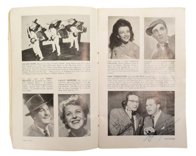 Morecambe & Wise (Eric Morecambe 1926-1984 and Ernie Wise 1925-1999) - early autographed theatre programme from Blackpool for a 'Garden Party Stage & Radio' show in 1955. Signed to the internal pages by some of the acts appearing, including Morecambe and Wise. Other autographs include Kenny Baker and the Five Smith Bros. Supplied with a handwritten letter of provenance from the original owner.