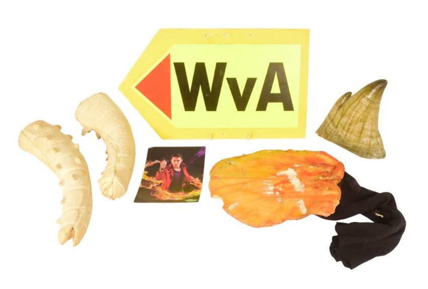 Wizards Vs Aliens (2012-2014) - a collection of original production made props / items, comprising: two latex Jathro tentacles - unpainted and unfinished, a 'WvA' location filming plastic sign, a painted 'flipper' type appliance (foam latex), and a painted foam horn. Accompanied by an original Tom Clarke 6x4" cast card from the series. Wizards Vs Aliens was created by Russell T Davies and Phil Ford of Doctor Who fame. The show was created to fill the schedule gap left by The Sarah Jane Adventures after its cancellation due to the death of the programme's lead Elisabeth Sladen. Although much of the production crew were identical to Doctor Who, the series was independent and set within its own universe.