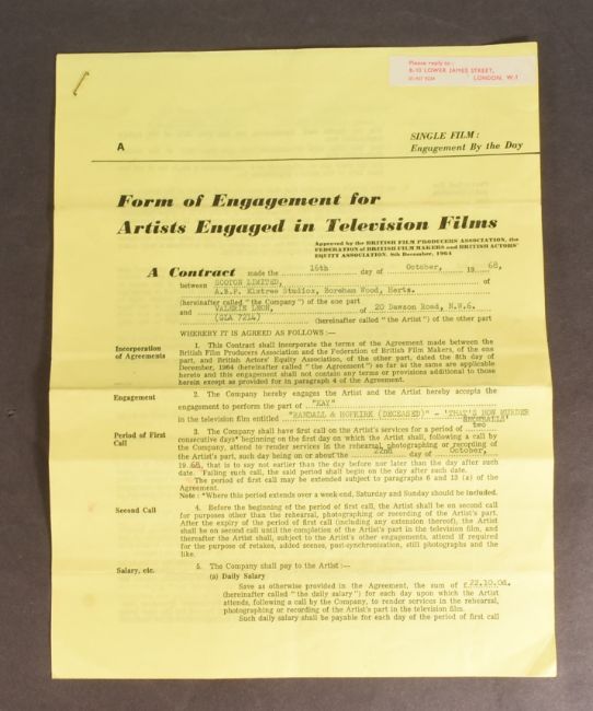 Randall and Hopkirk (Deceased) - (British paranormal detective series 1969-1970) - Valerie Leon's original filming contract for the episode 'That's How Murder Snowballs'. Contract dated 16th October 1968 between Scoton Limited at Elstree Studios and Valerie Leon. Leon was paid £22.10.0d per day, for a planned period of two days. Signed to the rear by Leon and the series' casting director. 58cm x 23cm on yellow paper. Along with a signed 8x10" black and white photograph of Leon in the role, signed in black ink. Production material from the short-lived series is rare.